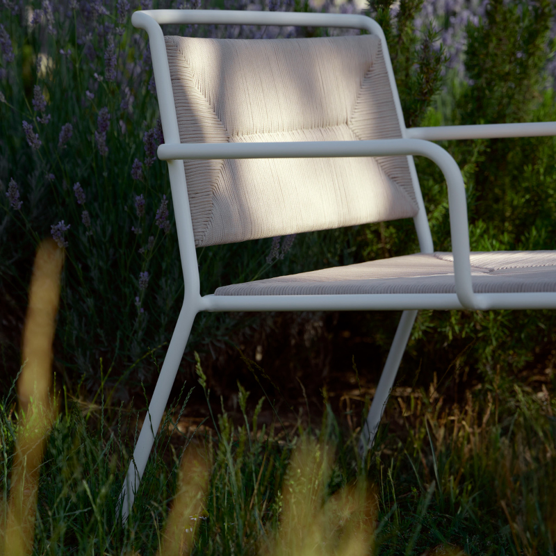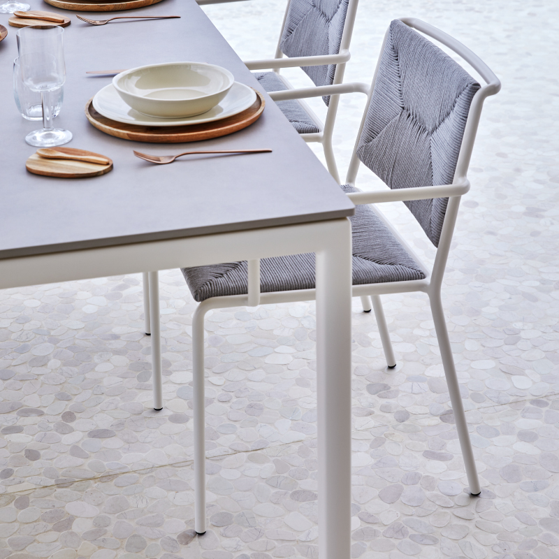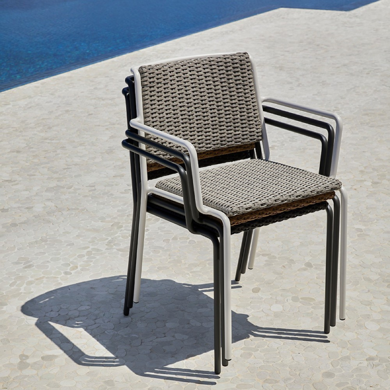 Silla apilable con estructura de aluminio pintado en polvo. Asiento y respaldo trenzado en fibra sintética Shintotex® o cuerda poliéster 4 mm. Acabado del aluminio en Gris metalizado 56.